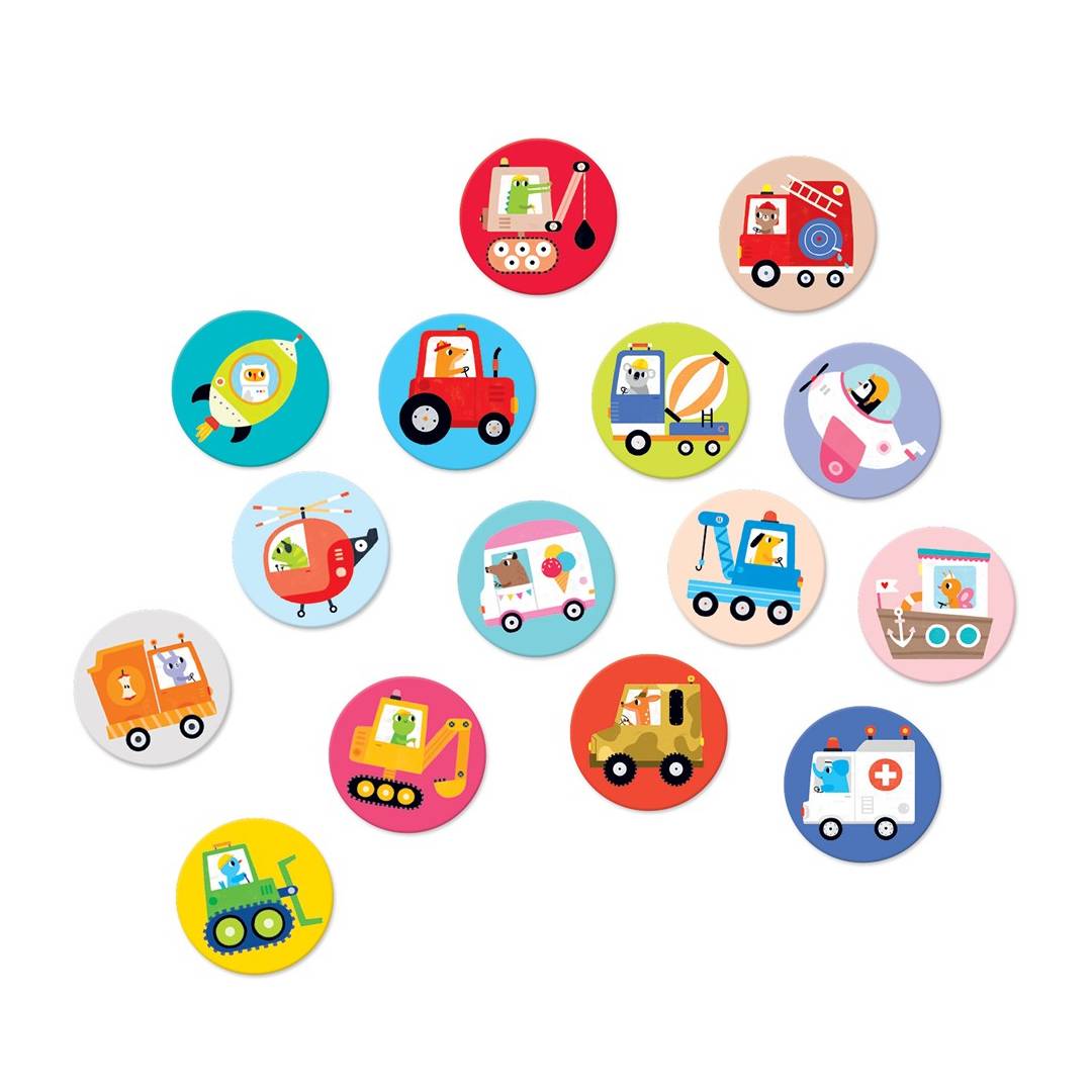 Βρουμ, βρουμ… Οι πολυάσχολοι οδηγοί και τα πολύχρωμα οχήματά τους προσκαλούν τα νήπια να παίξουν! Αυτό το εκπαιδευτικό σετ διαθέτει 30 μεγάλα κομμάτια και αποτελεί ένα τέλειο παιχνίδι μνήμης.