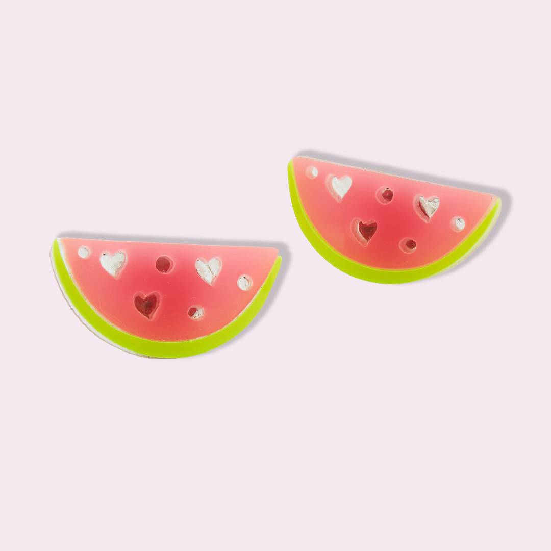 Σκουλαρίκια με καρπούζια σε φλούο χρώμα και ατσάλινο κλιπ για κούμπωμα.